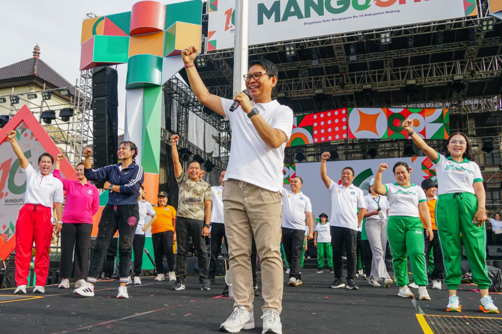 Dalam rangka memeriahkan Hari Ulang Tahun (HUT) Mangupura Ke-16, Bupati Badung I Wayan Adi Arnawa turut hadir dan berpartisipasi dalam acara senam bersama yang diselenggarakan oleh Tim Penggerak (TP) PKK Kabup...
